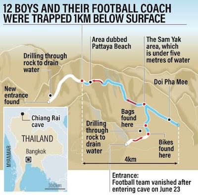 The Wild Boars football team became trapped on June 23 while they were exploring the Tham Luang caves with their coach after a practice session. Heavy monsoons fell causing flooding at the entrance. Some of the boys could not swim so they retreated further into the cave. Eventually they were pushed four kilometres deep inside the limestone cave complex.