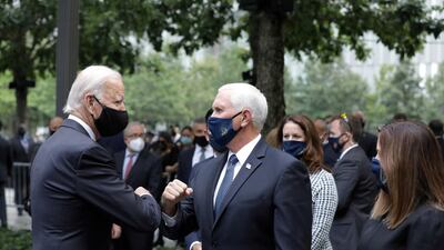 Democratic presidential candidate and former US Vice President Joe Biden and Vice President Mike Pence greet each other during the 19th anniversary of the 9/11 attacks at the National September 11 Memorial & Museum in New York City. Reuters