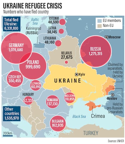 Russia, which has a 1,974-kilometre border with Ukraine, became the route out of Ukraine for 1.27 million people. For those fleeing west, Germany took in the most, almost 1.1 million, followed by hundreds of thousands in Poland, the Czech Republic, the US and UK.