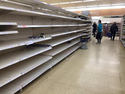 Long queues and empty shelves are becoming familiar scenes across the UK as panic buying grips the nation.