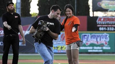 A cat who shot to fame after saving a California boy from a dog attack threw the first pitch on Tuesday night at a Bakersfield Blaze minor league baseball game. All photos by Kevork Djansezian / Reuters