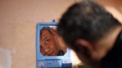 A Palestinian boy poses inside the frame of a broken television at the Al Shatee refugee camp in Gaza City. Mohammed Abed / AFP Photo -
