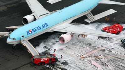 TV footage from the airport showed the plane, which was bound for Seoul’s Gimpo International, surrounded by dozens of fire engines and with the area around its left wing doused in foam. The plane’s inflatable emergency evacuation slides had all been deployed.