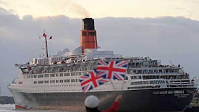 LONDON // Tens of thousands of Britons bade an emotional farewell last night to a great monarch of the seas. As fireworks exploded over Southampton Water, the booming horn on the Queen Elizabeth 2 blasted a final salute to the crowds lining the shore in the early evening as the ship left on its last voyage, heading for a new home in Dubai. It was a climactic finale to a day that had started embarrassingly for everyone connected with the 70,000-tonne liner when it ran aground while approaching its home port of Southampton for the last time. Extra tugboats had to be called in after high winds blew the QE2 out of the main shipping channel as it entered Southampton Water just before dawn. The liner briefly ran aground on Bramble Bank before being towed into port by five tugs, docking at Berth 38/9 an hour late. According to a spokesman for Cunard, the QE2's current owners, the grounding was "no more than a little bump when she touched a sandbank". He said the incident caused no damage or injuries. The grounding, though, served as a small reminder of the forces of nature that the QE2 has encountered and overcome in 5.9 million nautical miles travelled since being launched by the Queen on Clydeside in Scotland in 1967. It ran aground off the coast of Massachusetts in Aug 1992 damaging its hull, was severely damaged after a blaze broke out in an engine room in July 1976 and collided with a reef at Nassau in the Bahamas in Dec 1975. Other emotions came into play during the rest of its final day in Southampton. At 11am, during a farewell visit by the Duke of Edinburgh, a million poppies cascaded down on the ship, dropped by a biplane to mark the 11th hour of the 11th day of the 11th month - the moment the armistice was signed 90 years ago to mark the end of the First World War. The duke, who has accompanied his wife the Queen on several voyages aboard the QE2, met former captains of the vessel along with crew members who travelled with the ship when it served as a troop carrier for 3,000 soldiers heading for the Falkland Islands in 1982. Later, the ship's role in the brief war with Argentina was commemorated by a Harrier jump jet - the "workhorse" of the aerial campaign during the conflict - which hovered astern of the liner and bowed its nose in salute. The ship was stripped of its luxuries for the Falklands assignment, a far cry from what lies ahead when it completes its 17-day voyage to Dubai. There it will be transformed into a luxury hotel and exhibition centre at the Palm Jumeirah resort. Among the passengers sailing to the Gulf are Diana Baker, from Sydney, who is making her 25th voyage aboard the QE2. "I just had to be here," she said yesterday. "She is a real ship and the only real ship still left afloat." George Kehler, 43, had flown from his home in Tennessee to join the ship on which he first travelled as a boy of five. He has since made 14 voyages aboard the ship. Mr Kehler and his wife, Susan, whom he met on the ship during a cruise in 2003, were at the dockside as the vessel berthed yesterday morning. He was wearing a 1960s Cunard uniform that he had bought on the internet for US$200 (Dh734). "I felt it was an obligation to be here and watch her come in," he said. "She is the last of her breed and I felt that I owed it to her after all the pleasure given to me over the years." The Kehlers are among more than 2.5 million passengers that the ship has carried since entering service in 1969. Aside from dozens of members of the British and other nations' royal families, a host of celebrities, including Bob Hope, Paul Newman and Elizabeth Taylor, have been among the guests in the luxury suites. Still the most powerful and fastest merchant ship afloat, the QE2 has crossed the Atlantic more than 800 times and completed 25 world cruises. Tickets for the final voyage of the QE2 sold out in just 36 minutes when they went on sale last year. The voyage, which will include stops in Lisbon, Naples and Alexandria, will end on Nov 27 in Dubai. More than £3 million (Dh17m) was paid out by almost 1,800 passengers for the one-way trip. Prices for the two grand suites were nearly £18,000 for each person while the cheapest accommodation, a standard inside cabin, cost more than £4,000. When the ship arrives in Dubai, retired Commodore Ronald Warwick, the longest serving master on the QE2, will return as the owners' representative on board during a multimillion-dirham conversion. Cdre Warwick, who commanded the ship for 14 years, is the son of William Warwick, the liner's first captain. dsapsted@thenational.ae