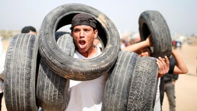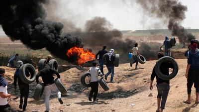 Palestinians burned mounds of tyres and threw stones at Israeli soldiers over the border fence, who responded with tear gas and live fire.
