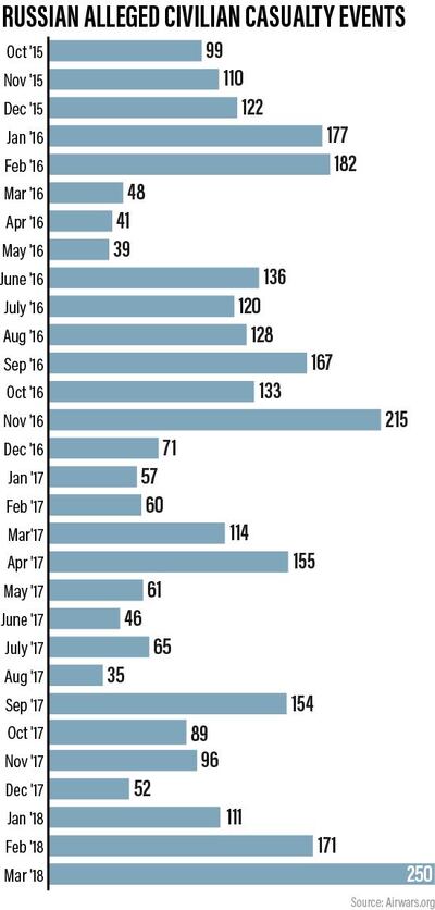 The monitor tracked 250 civilian casualties in March attributed to Russia and centred around the area of eastern Ghouta, the besieged enclave where Russia launched a bombing campaign in late February in a bid to wrestle the remaining rebels in the area into submission.