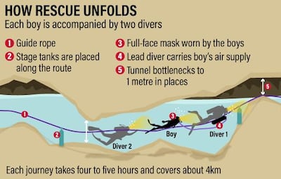 Two divers will accompany each boy, guided by a rope. When faced by a narrow passage they divers will release the oxygen tank and gently guide the boy and the tank through seperately.