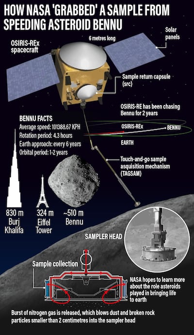 The Osiris-Rex spacecraft landed on asteroid Bennu on October 21, 2020, to collect samples that could help scientists gain insights into how the solar system was formed 4.5 billion years ago.