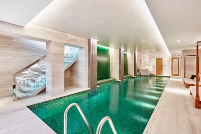 The mosaic-lined pool has underwater and ceiling speakers. There is also a separate Jacuzzi spa, a thermo-treated Aspen wood sauna with mood lighting, a marble steam room and a changing room.